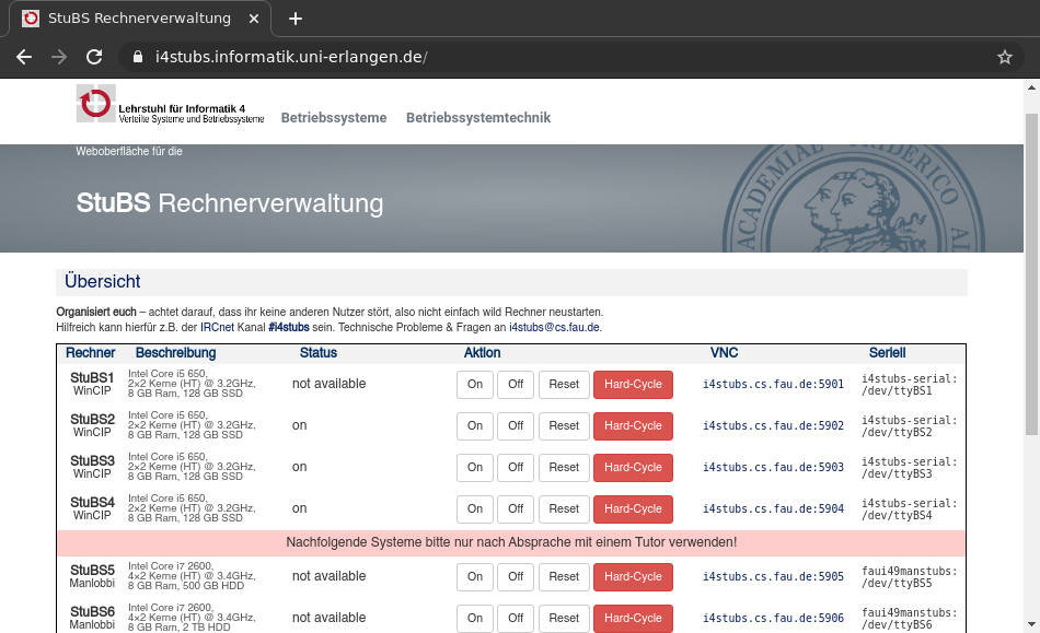 Since errors can sometimes sneak in during operating system development, you have to extensively test your solution before you hand it in. You can use an emulator (Qemu) and the dedicated StuBS test hardware (our reference platform) located in the WinCIP. The presentation of your solution is done on the test hardware, a solution only running in an emulator is not sufficient!