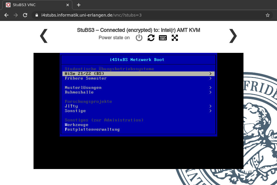 This will compile your StuBS and copy the system image to the TFTP server so that the test hardware can access it with the help of the network boot loader PXELinux. The test hardware automatically boot from the network when they are switched on. In the boot menu that appears, you only have to select the current semester and then the entry with your login name to boot your kernel.