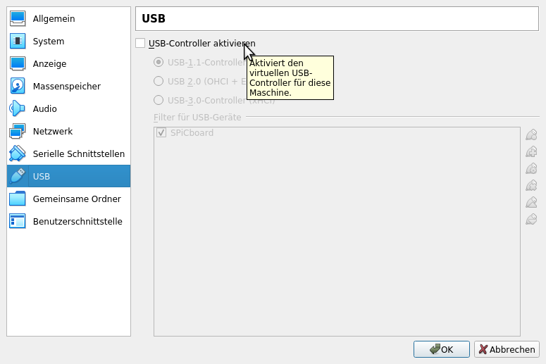 Save with OK and start the VM. These settings are enough to complete the exercises, however, you won't be able to program a hardware SPiCboard.
