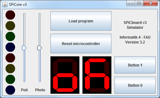 Since winter term 2019, there is a new version of the SPiCsim, which is a better simulation of the different peripherals (brightness of the LEDs/7-digits, noise of the ADC) and also supports the OLED display. Additionally, finding errors is easier through the GDB interface and a Value Change Dump. The graphical interface can also display other skins such as the coffee machine and signal lights.