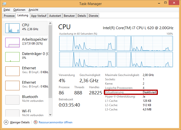 To test unter Windows whether the the support is activated, you can open the Task Manager, search for the CPU tab – in the main window the state Virtualization shall be visible.