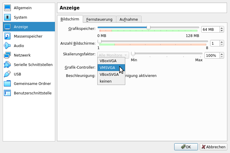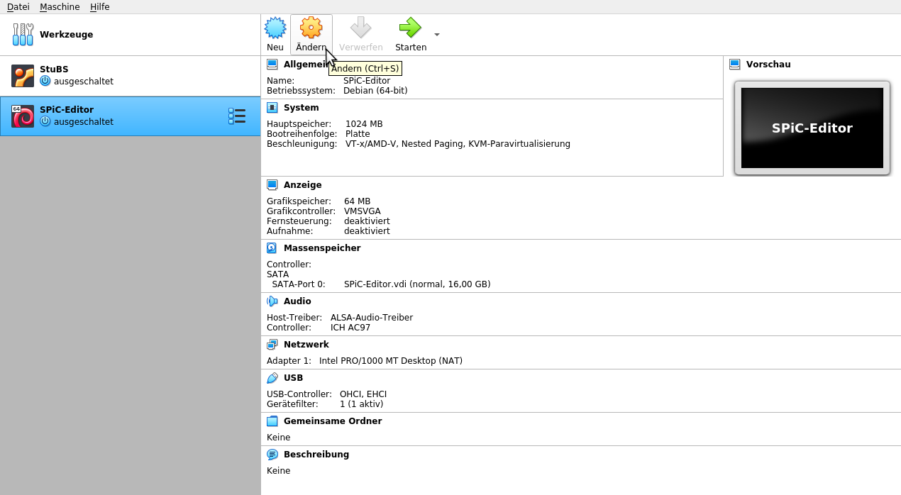 • Bei Darstellungsproblemen gegebenenfalls via Rechtsklick und Ändern auf die Einstellungen der SPiC-Editor VM in VirtualBox wechseln, dort unter Anzeige den Grafik-Controller wechseln und die VM starten