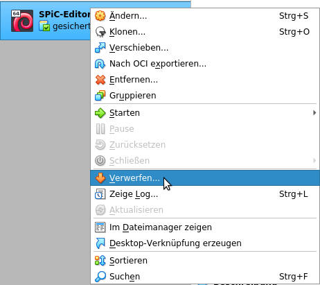 • Lösche das Arbeitsspeicherabbild, indem du mit der rechten Maustaste in VirtualBox auf SPiC-Editor klickst und im erscheinenden Kontextmenü Verwerfen... auswählst. Bestätige dies auch im nächsten Fenster mit Verwerfen.