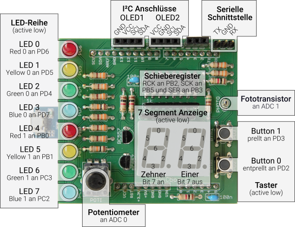 Die Übungsplattform, die seit über 10 Jahren im Rahmen des Übungsbetriebs zu den Veranstaltungen Systemnahe Programmierung in C und Grundlagen der systemnahen Programmierung in C verwendet wird, besteht aus dem SPiCboard und einem programmierbaren Mikrocontroller. Das SPiCboard ist mit verschiedener Peripherie bestückt (acht LEDs, zwei Taster, einem Drehpotentiometer, einem Photodetektor sowie einer zweistelligen 7-Segment-Anzeige) und muss selbst gelötet werden.